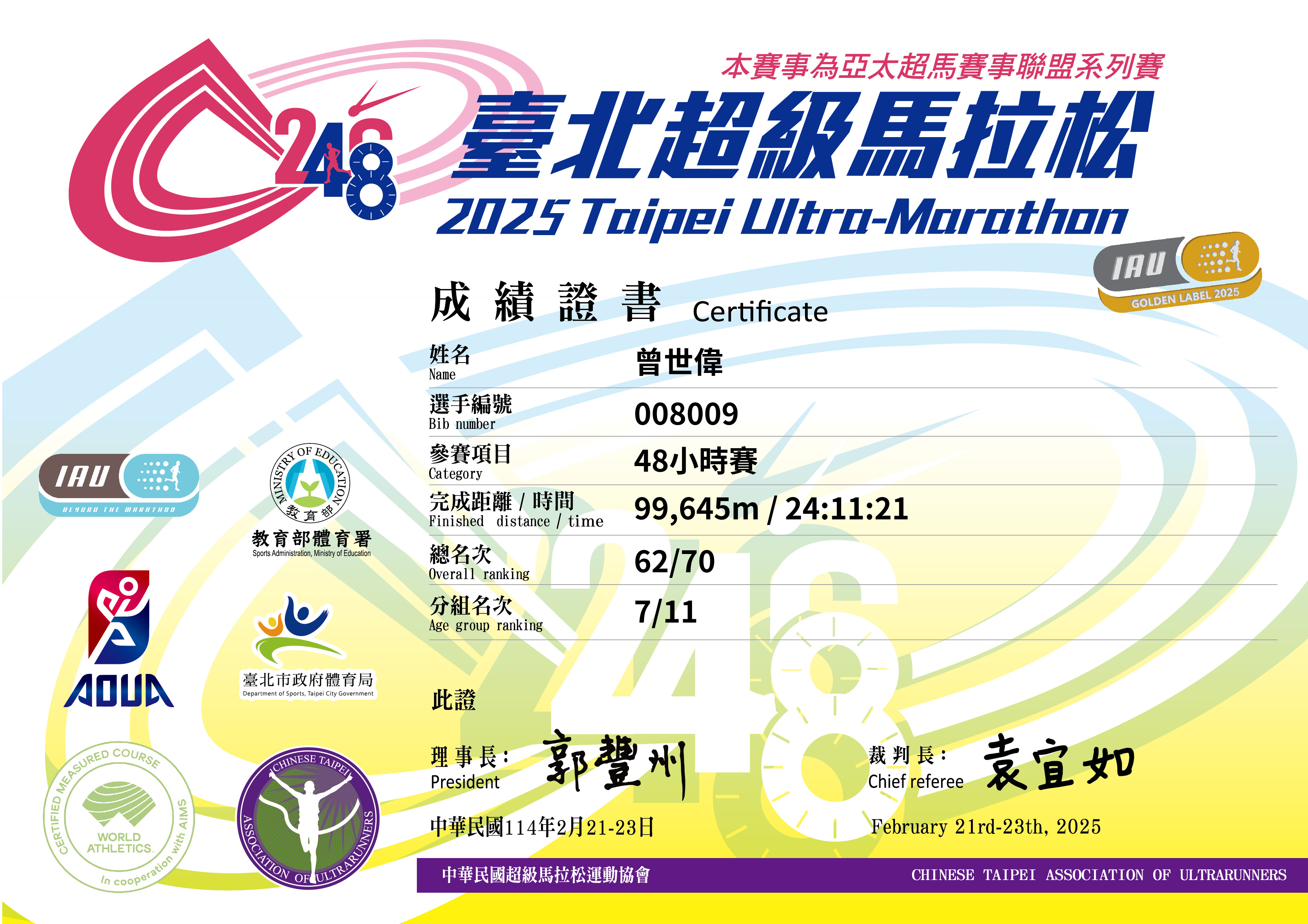 - 即時成績排名僅供參考,正式成績排名應以主辦單位公告為準。