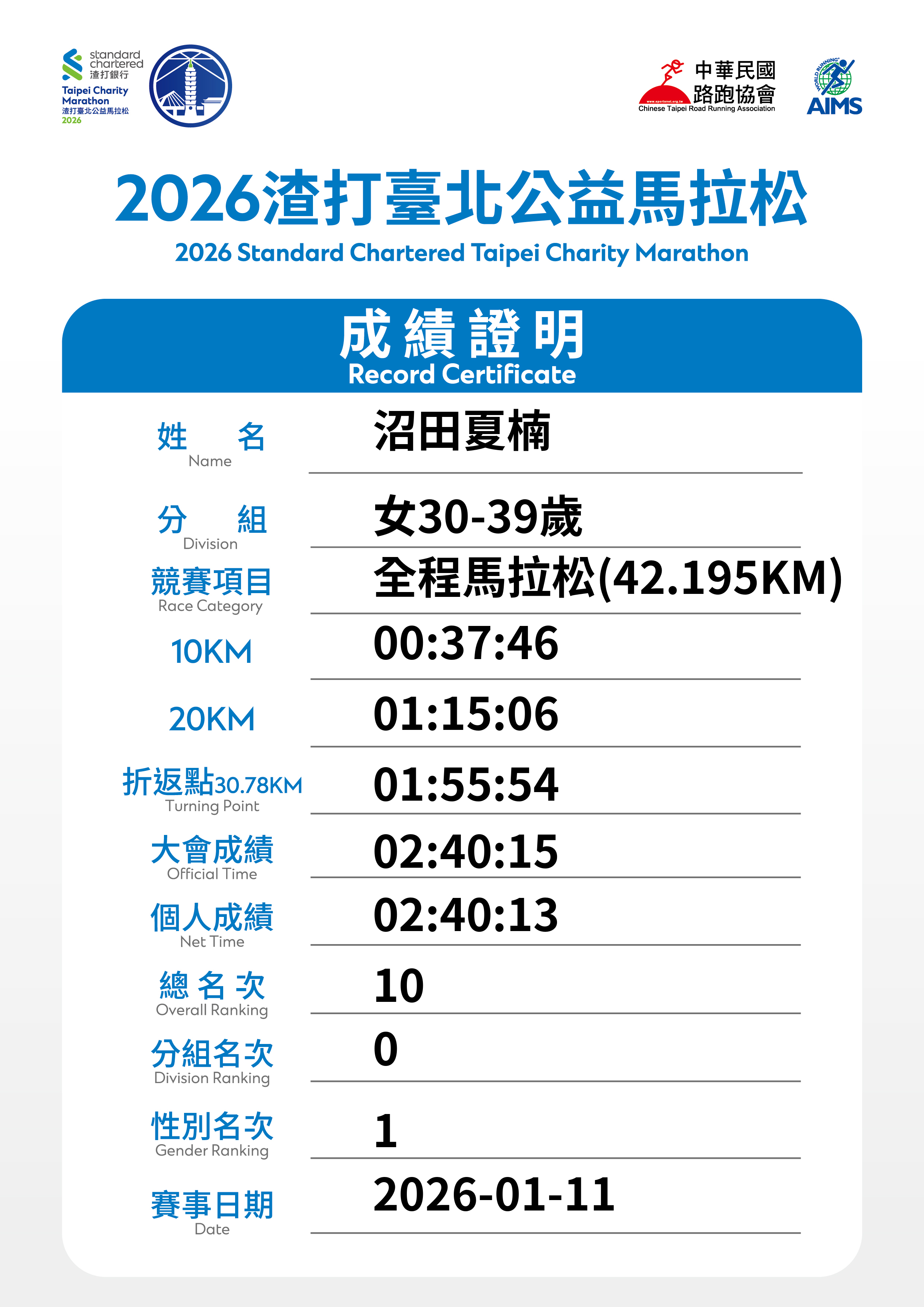 大會成績 Official Time