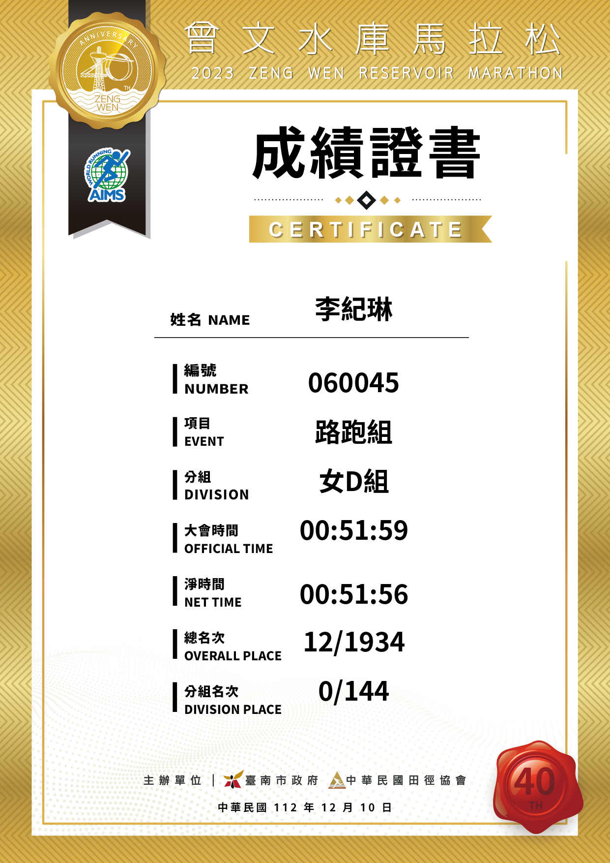 大會成績 Official Time